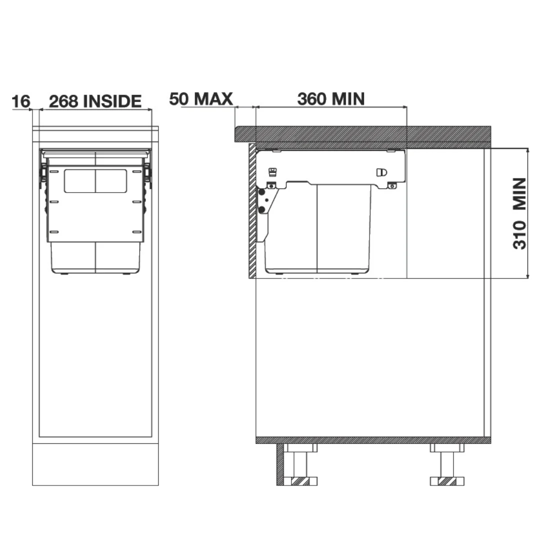 | Features: | Hideaway Compact bins are compact in design, making the range ideal for areas with limited space The unit is top-mounted, and this mounting panel acts as a cover for the pails Adjustment provided in the door bracket Liner holder to secure bin liners in place Over extension soft close ball bearing slides |